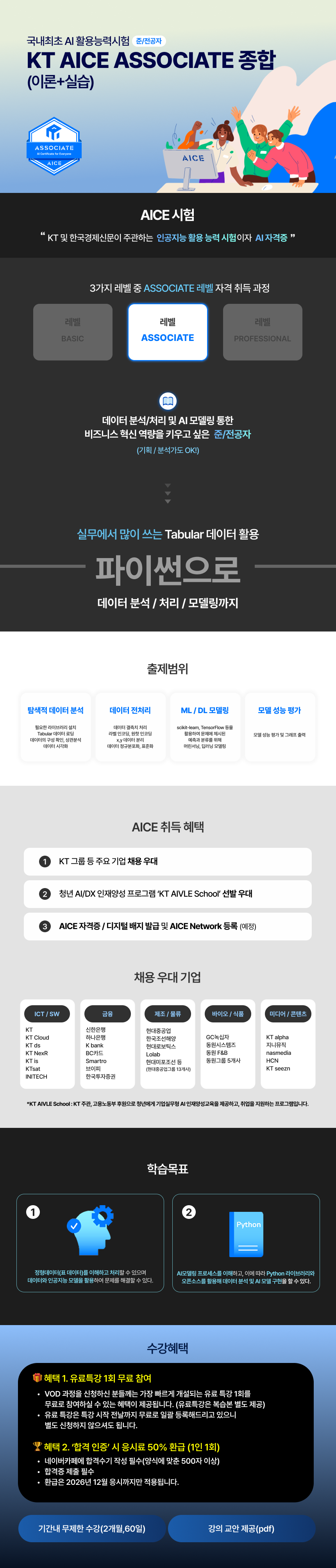 또한 금융 AI, LLM 평가 등 최신 AI 트렌드 연구를 병행하며, AICE 자격증 취득을 넘어 실무 역량까지 확장할 수 있는 강의를 제공합니다.